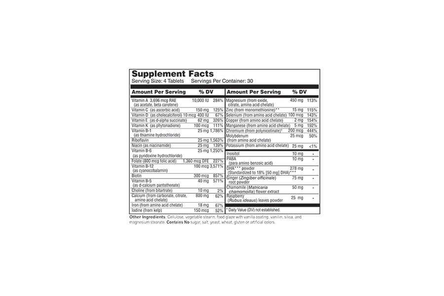 Prenatal Plus provides optimal amounts of all essential vitamins and minerals, along with added support ingredients such as the omega-3 fat DHA and herbs such a ginger and chamomile.